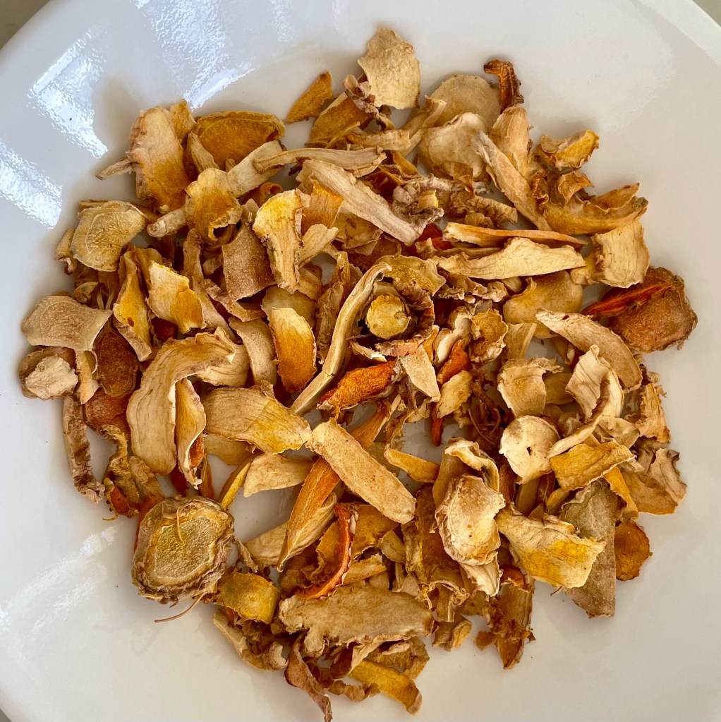 Here is some of my dried turmeric slices. Since it was dried in the sun, it’s lost some color. Instead of grinding all the turmeric slices at once, you can store in the air tight container in a cool dark place and grind enough powder to last you several weeks.