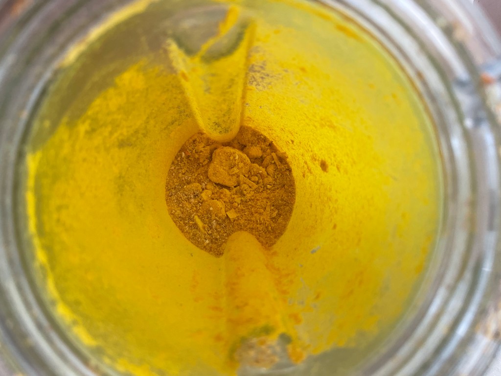 Place the dried turmeric slices in a food processor, coffee grinder or some kind of electric spice grinder. In India, the turmeric slices are pounded into a powder using a stone mortar and pestle. I am speeding up the process by using the smaller container of my Vitamix.